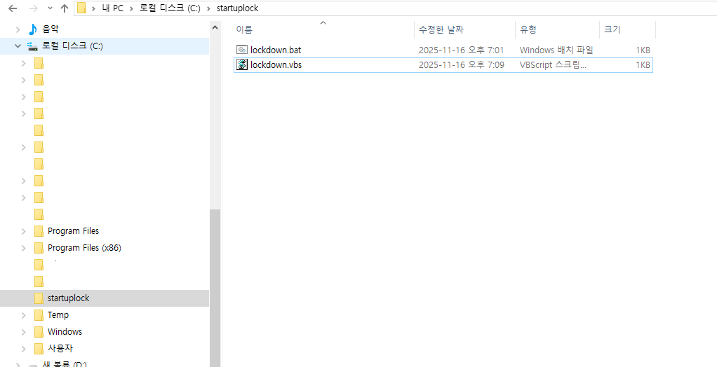 lockdown.vbs의 바로가기를 만들어서 넣어둔다.